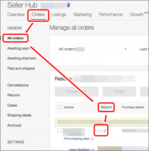 [Seller Hub]の[Orders]をクリックすると、注文状況が確認できるページに遷移するので、この遷移したページの[Record]列に書かれている数字をクリックすると、顧客情報ページに飛ぶことができます。